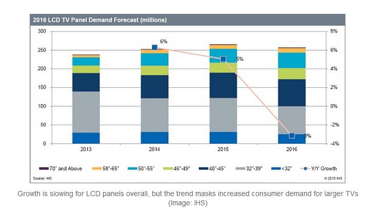 While overall shipments for LCD panels are expected to decline in 2016, consumer preferences are pushing up demand for larger panels.