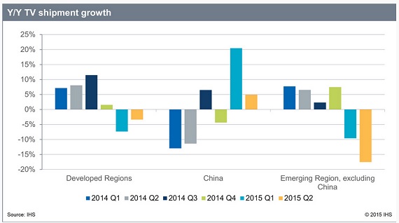 TV shipments in emerging markets had a steep year-on-year decline in Q2 2015 (Source: IHS)